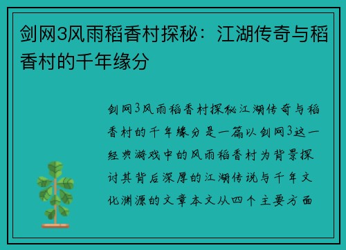 剑网3风雨稻香村探秘:江湖传奇与稻香村的千年缘分